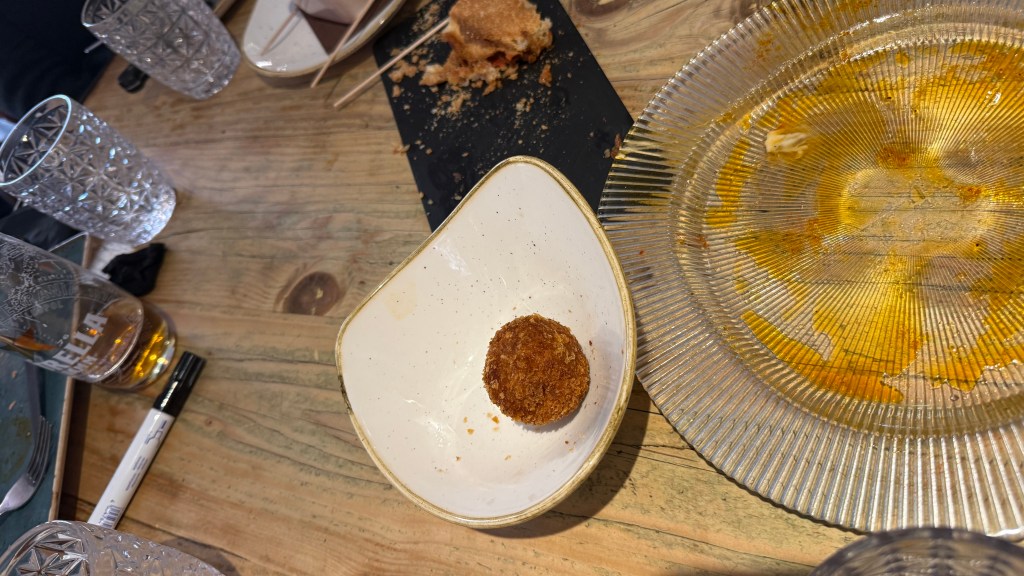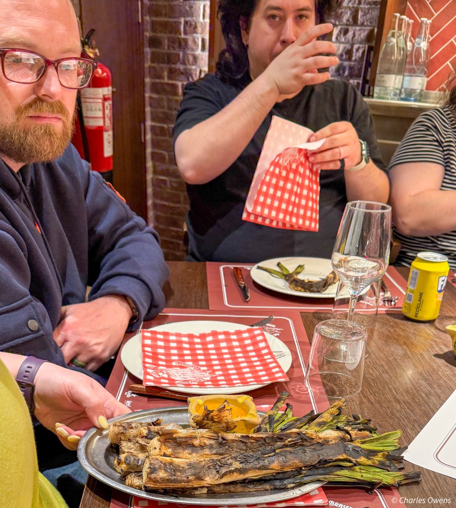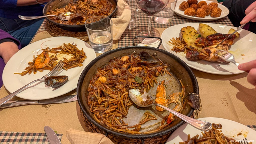 We then had our last meal. Not the last one ever but it was the last one the 10 of us would share and it was fabulous. It was a completely traditional Catalon meal. It was also at the traditional time. The Restaurant did not open until 8:00 in the evening. There were many large family/party groups. It was quite memorable. We had grilled and burnt on the outside leaks. They had been described as onions and I had imagined green onions but these were the same shape but about ½ to ¾ of an inch thick. We were instructed to remove the burnt layers from the onions. I immediately thought of my complaints about shrimp in most places that are served with the shell on. Why does the chef not handle that in the kitchen. Nevertheless, we removed the burnt layers and dipped the end in a very delectable sauce. Rather than cutting the onion into pieces you are supposed to dip the end then dangle the long onion over your mouth and then bite off the end, then repeat. It was pretty good.