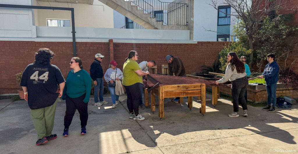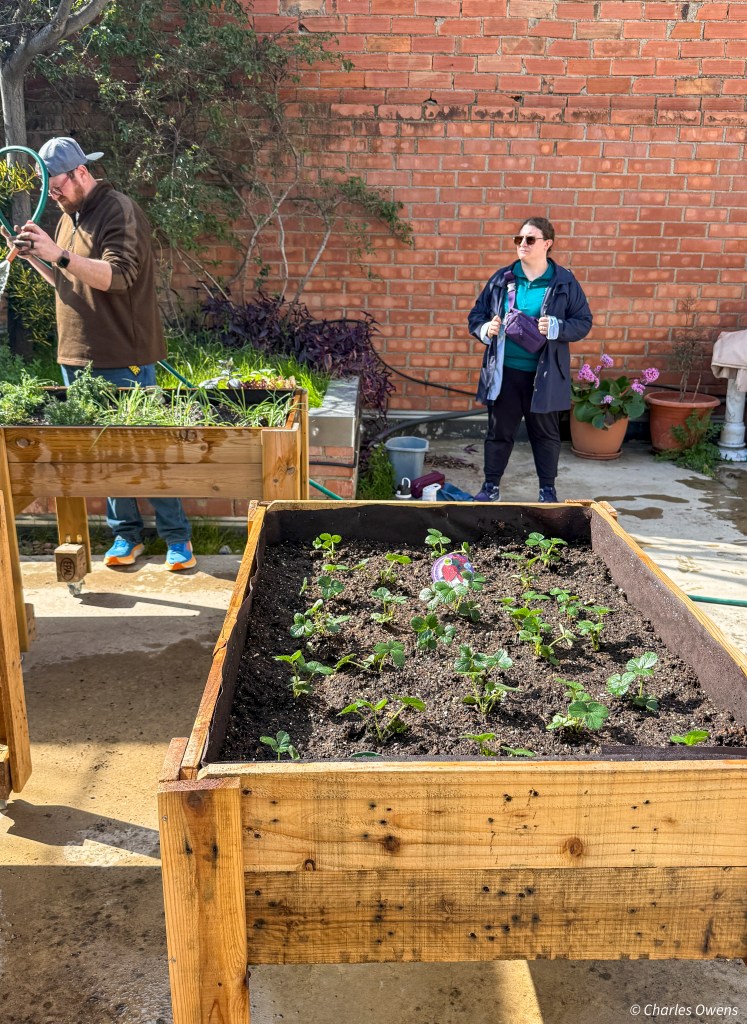 We had fun lining the wooden planters with material that would allow water out of the gaps in the slats on the bottom so the plants did not sit in the overly wet soil. We planted the vegetable plants they had purchased. It was a bit of a cartoon to see a bunch of people who had very little gardening experience set out create a garden. But it was fun,