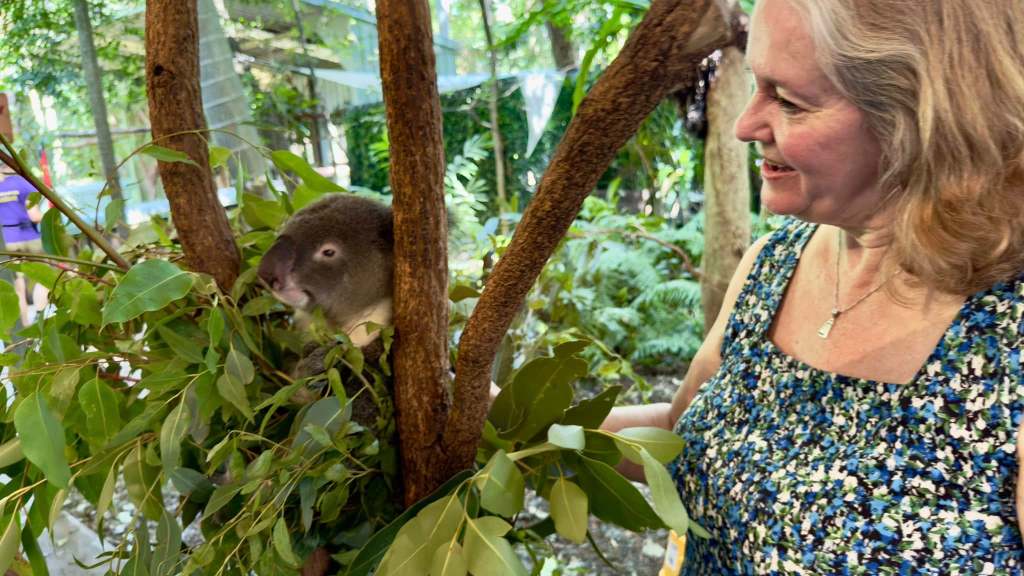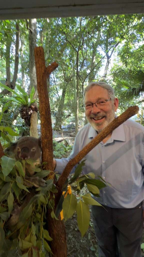 We bought entry tickets and special time to get up close and personal with a koala. We had about an hour to wait for our koala time slot. We decided to walk around the sanctuary. It is pretty large and the place has a maze of paths and gates and dead ends. It was hot and void of staff. What happened was that we were lost trying to get back to the koala starting place. We almost died! We finally made it back with a minute to spare. We did get in line to be with the koala and the line moved slowly. Penny was able to get some water and we were very refreshed by getting to pet the koala. It was a great, really great, experience. We then sat in the koala kingdom. An open area with picnic tables and trees full of eucalyptus leaves with cute koalas in abundance. We also had visitor who walked in or flew in. See the pictures.