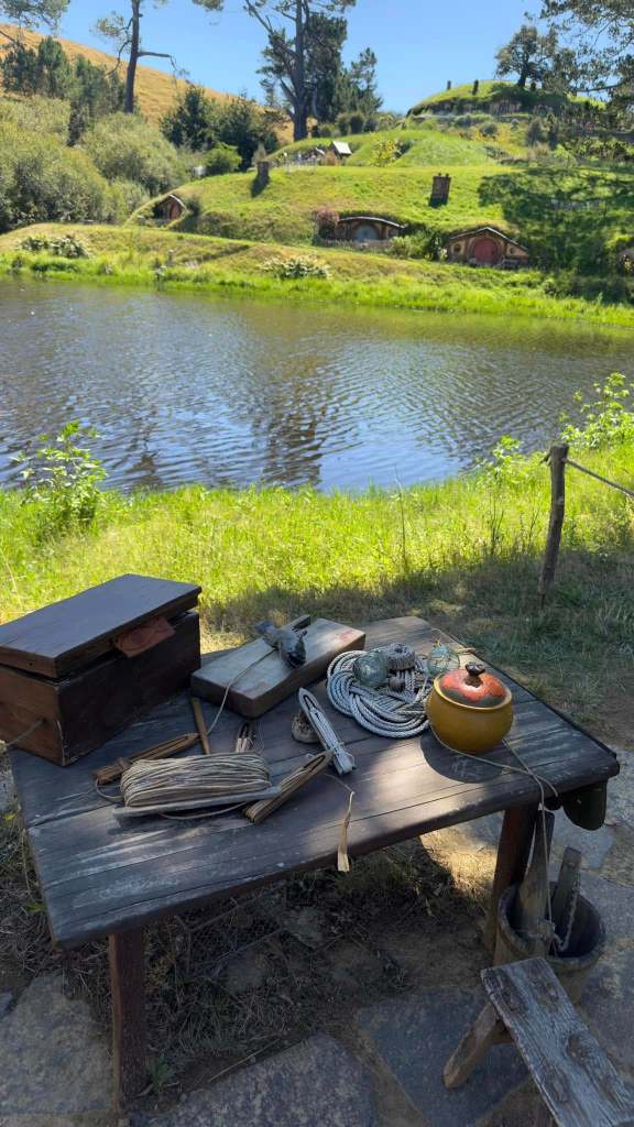Getting close to the shire.GollumThe mountain beyond the ShireThey provide a person guide for a group of 40 They leave every 15 minutes and our guide was from England.The first steps into the ShireHere we are in Baggends, The ShireEach color of door belongs to a different hobbit family name. The higher up the hill side the hobbit hole was located the wealthier the family was. At the bottom of the hill was a pond. In our society a pond front property would be more expensive?small town bulletin boardThe pond. The wake was made by that duck landing and skiing across the surfaceI am a Greybeard the wizard sized fellow on this 65% sized hobbit holeI have lots of Party business to discusss.Inside the Proudfoot homeThe shire millIn the green dragonThe fishing hole