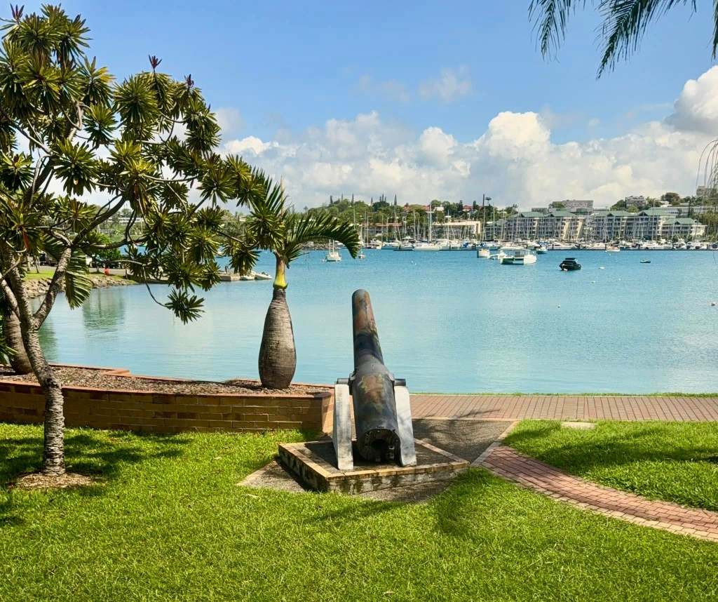 Morning view out the balconyThese reminded me of the badminton birdies on the Nelson art museum lawnOur ship has not left me here yetAustralia gave these guns to New Caledonia for defense against invasion. They have a navy and army, but have never been invaded.There is a crab in that hole.