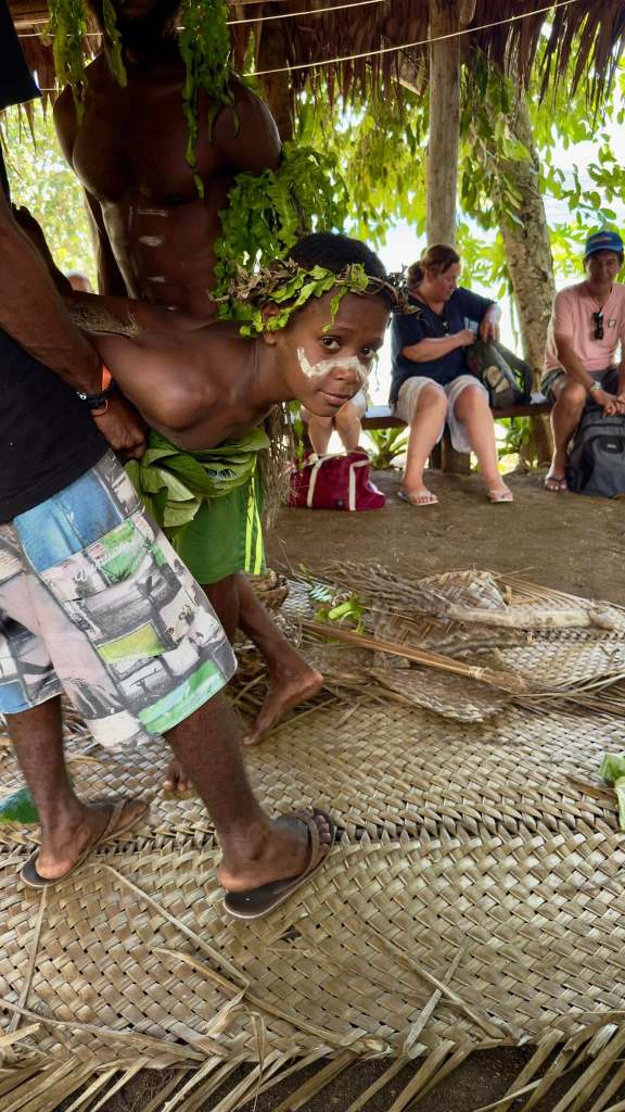 Our excursion started at 7:15 am and was a Keamu cultural village immersion. Keamu is the name of the village that is near the beach on the main island. The residents of this village have created a business during the cruise ship season. They create a realistic portrait of life on the island some 25 to 100 years ago that would have included no running water and no electricity. But today they have running water from springs in the hills above. There are solar street lights. And I can assume they have a way to charge their phones some were carrying. But they did a great job of display the traditional means of gathering and using the plants. Two ladies sat weaving from palm trees leaves. They were very adept.