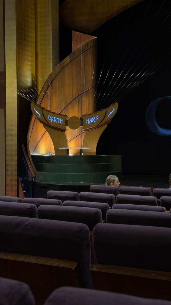 After dinner we went to the production show called “Sonic Odyssey”. Penny saw someone play an earth harp before on America Has Talent. The strings are stretched from the stage above the audience to the balcony railing. There were also singers and dancers as part of this very spectacular show which we really enjoyed.