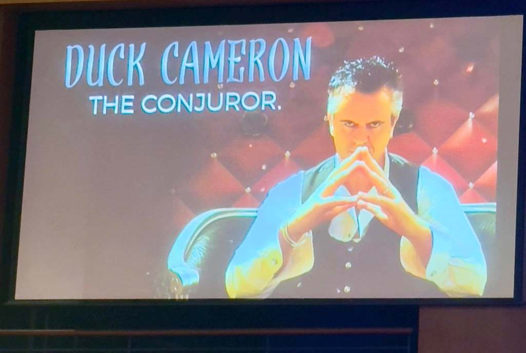 We are sitting in the theater to watch Duck Cameron. No, not a typo his name is Duck as in quack quack. He was very entertaining getting several people from the audience to participate.