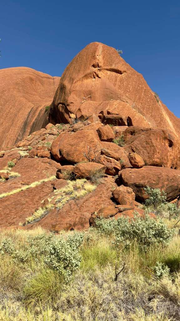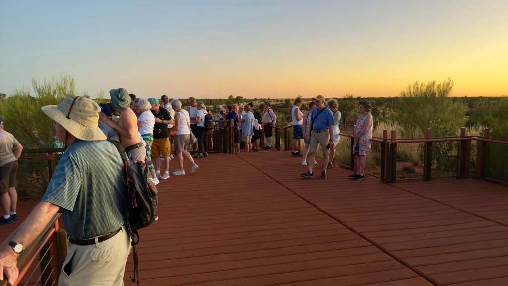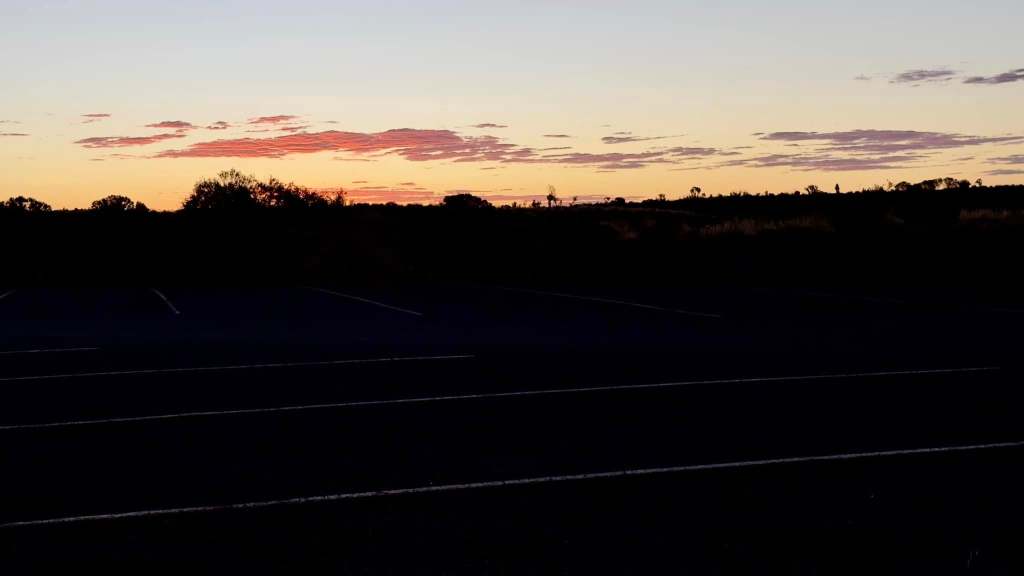 Another early morning. We were off at 5:15 to experience the sunrise at a different spot than we experienced the sunset. This was necessary because the sunsets in the west and rises in the east. This is true even though we are in the southern hemisphere in order to see the effect of the setting and rising sun on the appearance of the rock known as Ayer’s rock or Uluru. It is a giant sandstone structure that is more underground than above. It has been a large part of the indigenous people’s story, who have lived in this area many thousands of years. Or if you ask the indigenous people how long their cultures go back in time they are likely to tell you that they have been here since the beginning of time.