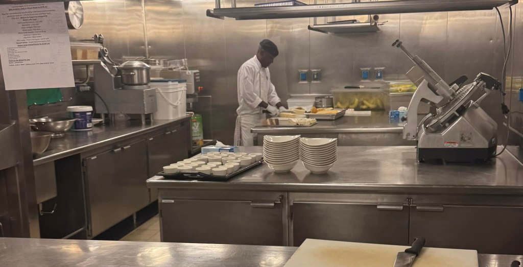 We took a tour of the kitchens. It was amazing that the kitchen workers do everything from scratch, no prepackaged foods are ever served.