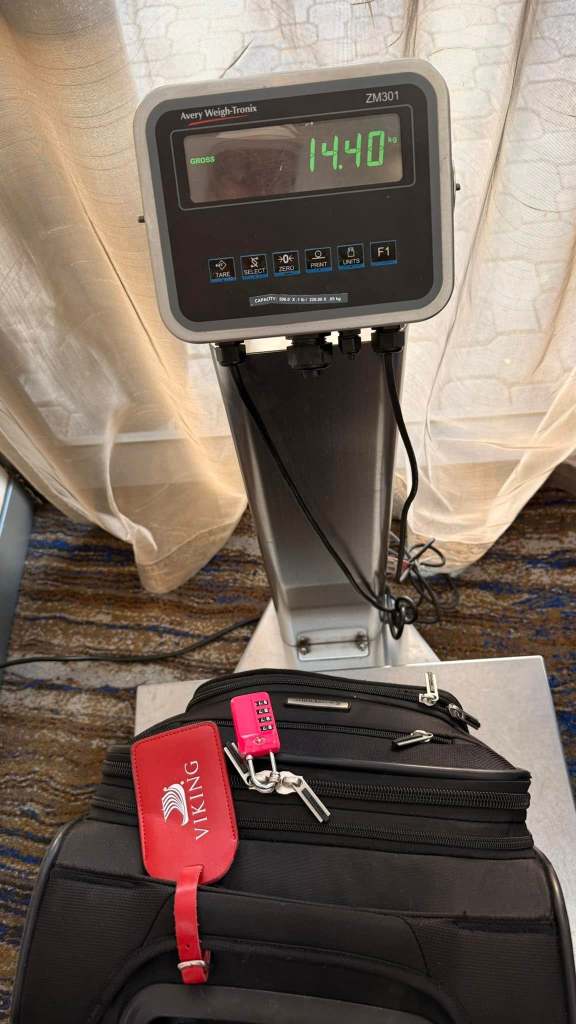 This was when we had a rather bizarre and unnecessary dance with the employee checking our luggage. We had no problem with Penny’s carry on. She had a bag that was around 5.5 kilograms and a personal bag that they did not weigh but it was about 1.5 kilograms. I on the other hand had my Rick Steves backpack and computer and jacket inside my one carry on bag and it weighed 14.4 kilograms. Sorry, I was told, it could only weigh 10 kilograms. So I took my jacket out and put it on. My backpack came out as my personal item (purse) along with a bag of electronics that Penny had put in my bag to lighten her bag which we now put back in her bag. Weighed the bag again without those items inside, 10 kilograms. I was good to go.