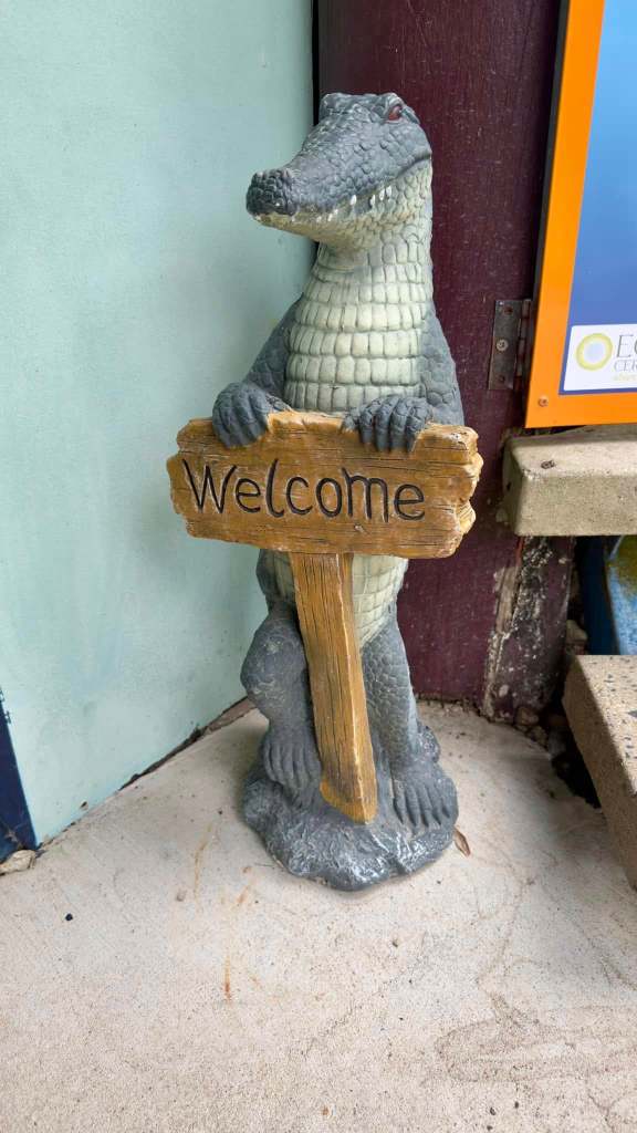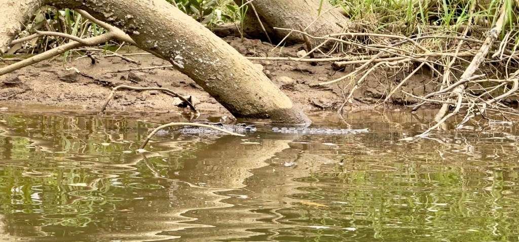 The bus took us to the boat. Learned about the Salty AKA saltwater crocodiles. In the summer the crocodiles tend to remain in the water to control their body temperature. We did see one lying about under a fallen tree branch.