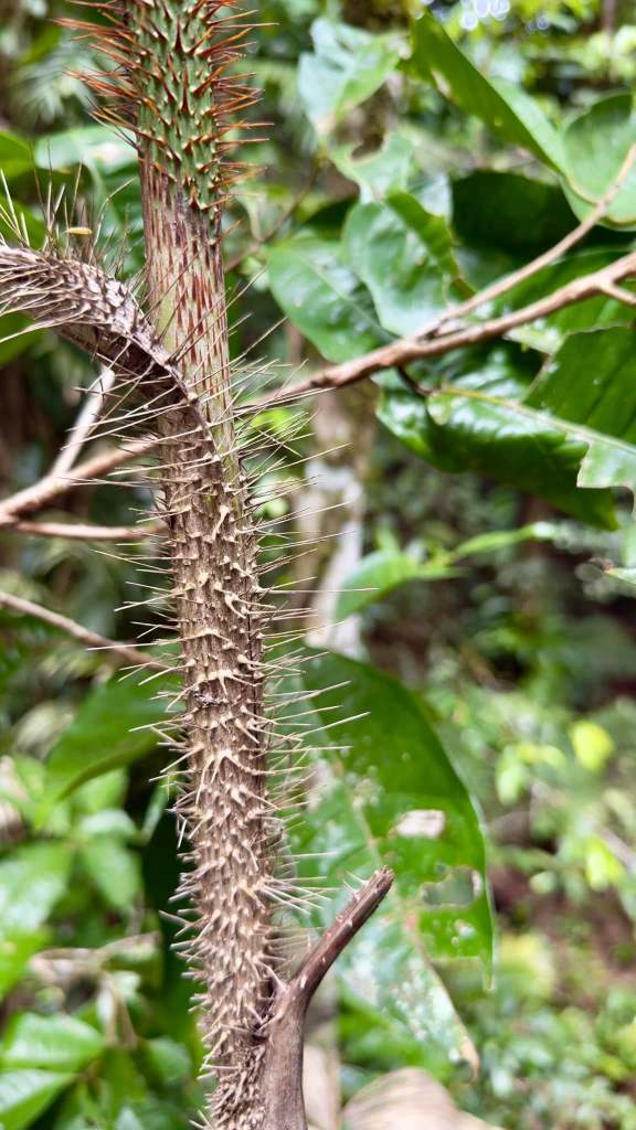 Despite the signs posted for no swimming these folks and plenty of other we met on the trail were in fact swimming.Some of the things growing on the stuff growing in the rainforestSome of the things growing on the stuff growing in the rainforestThis tree evolved ways to discourage things coming too close.In this ancient rainforest the flowering plants are frequently small flowersThis is Levi. He told that the stadium in San Francisco is named after him.When you live and work in a rainforest you can get a lot of water running off the roof. This section of the gutter catches the rain falling off the roof.