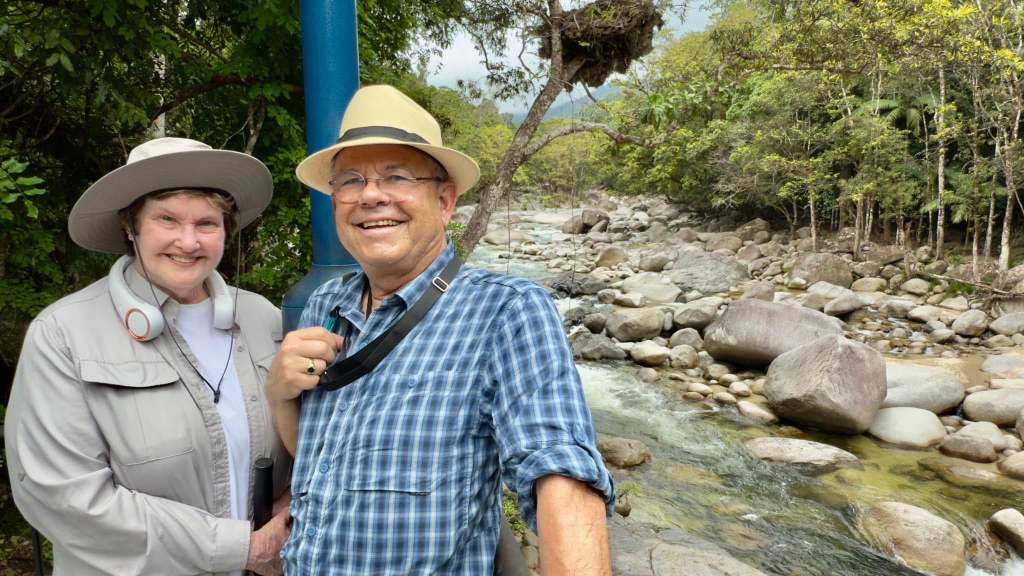 A salty lying in waitThe riverA fishYou can see to the right how far below is the river flowing.Salty saying hi!Jeanette and Frank in the rain forest